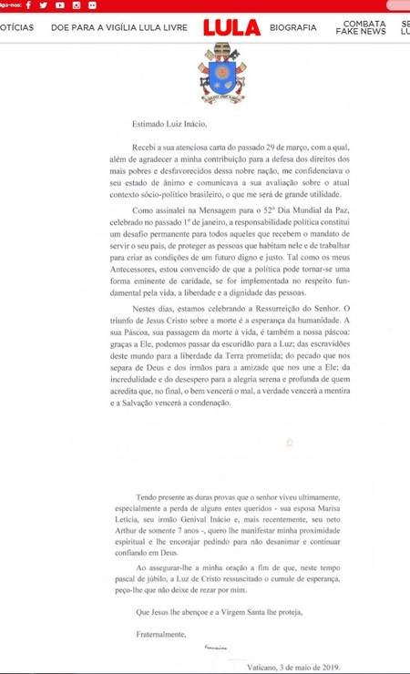 Na verdade o que houve foi uma resposta trazida por um bispo brasileiro à família do ex-presidente de uma Carta encaminhada pelo ex-presidente Lula ao Papa Francisco pedindo-lhe oração, dada as circunstancia das perdas familiares sofridas por Lula desde a morte de sua esposa Marisa Leticia em 03 de fevereiro de 2017. Quem assina a Carta é o secretariado da Santa Sé, órgão responsável em atender demandas encaminhadas de qualquer pessoa seja ela católica ou não. Lula foi respondido como cidadão católico romano e não como ex-presidente como assinala a matéria publicada pela Folha de São Paulo e endossada pela Rede Globo através de notícia do jornal O Globo de quarta-feira (29 de maio).