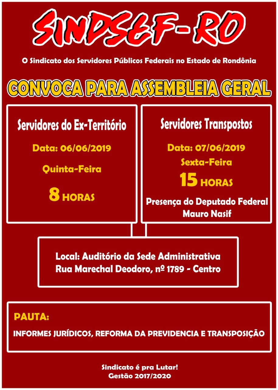 O Sindicato dos Servidores Públicos Federais no Estado de Rondônia (Sindsef-RO) convoca os servidores do ex-Território para Assembleia Geral que será realizada nesta quinta-feira, dia 6, às 8 horas e os servidores transpostos para o quadro federal para Assembleia Geral, nesta sexta-feira, dia 7, às 15 horas.