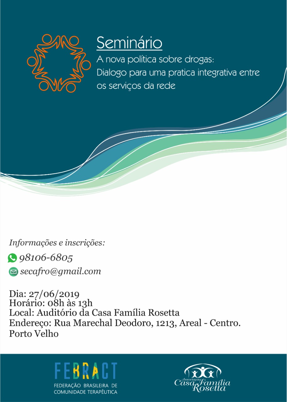 A Associação Casa Família Rosetta e a Delegacia Rondônia da Federação Brasileira de Comunidades Terapêuticas–FEBRACT, em ocasião da Semana de Enfrentamento e Prevenção ao Uso/Abuso de Álcool e outras Drogas, estarão realizando no próximo dia 27 de Junho, o Seminário com o tema “A nova Politica sobre Drogas: Dialogo para uma pratica integrativa entre os serviços da rede”.