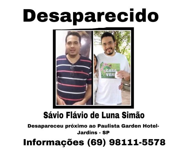 O porto-velhense Sávio Flávio de Luna Simão desapareceu na noite desta quinta-feira27, em São Paulo, onde se encontrava com os pais para fazer tramento de saúde. O desaparecimento ocorreu próximo ao paulista Garden Hotel, no Bairro Jardins. Informações: (69) 98111- 5578.