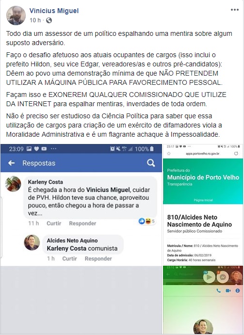 E desta forma, no postagem de Vinicius Miguel ele cobra a verdade por parte do prefeito e seus assessores. Assim escreveu Miguel: Todo dia um assessor de um político espalhando uma mentira sobre algum suposto adversário.