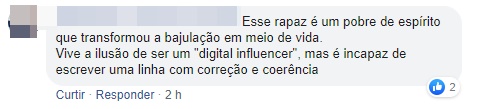 Por fim, em contato via menssenger, o professor Vinicius detonou: "Fica uma dica, tem erros de gramática na descrição da sua página. Fica feio para um auto-proclamado digital influencer ter erros no próprio perfil".