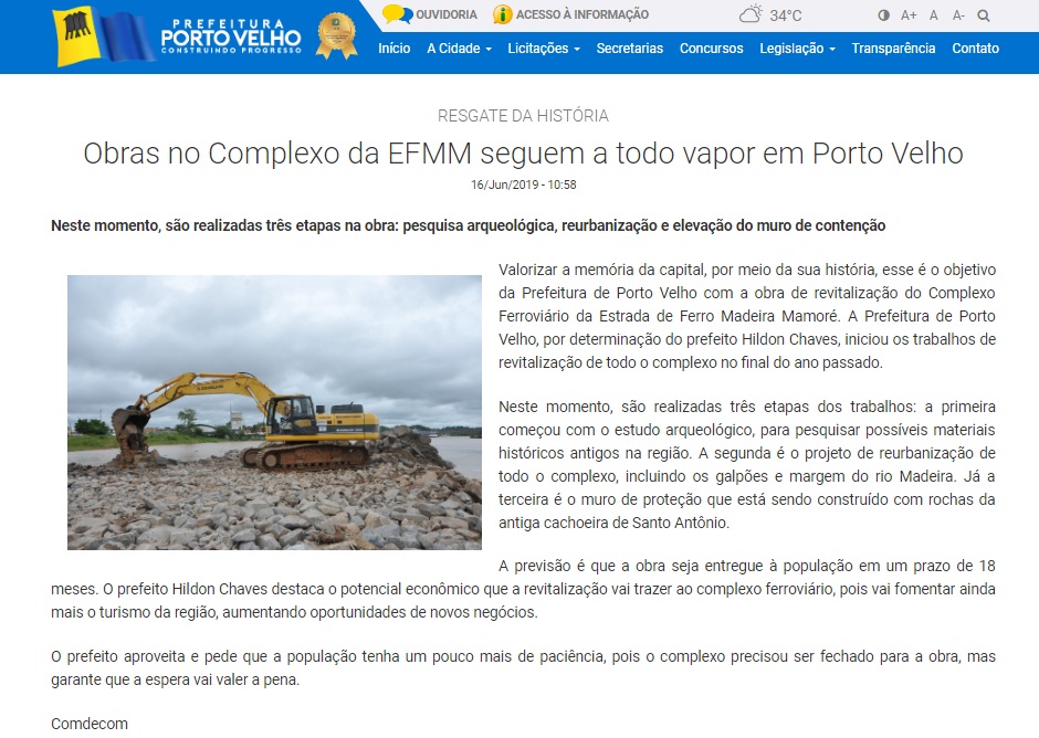 “A Prefeitura de Porto Velho, por determinação do prefeito Hildon Chaves, iniciou os trabalhos de revitalização de todo o complexo no final do ano passado. Neste momento, são realizadas três etapas dos trabalhos: a primeira começou com o estudo arqueológico, para pesquisar possíveis materiais históricos antigos na região. A segunda é o projeto de reurbanização de todo o complexo, incluindo os galpões e margem do rio Madeira. Já a terceira é o muro de proteção que está sendo construído com rochas da antiga cachoeira de Santo Antônio”, afirma trecho do material.