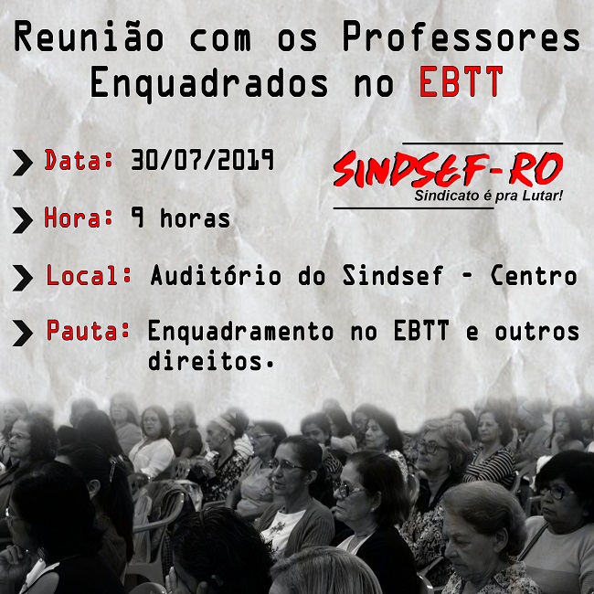 O Sindsef convoca os professores enquadrados no EBTT (Ensino Básico Técnico Tecnológico) para participar de reunião com a diretoria executiva do sindicato e Advogados do escritório Fonseca & Assis, no dia 30/07 (Terça-Feira) a partir das 9 horas da manhã, no auditório da Sede Administrativa do Sindsef – Centro, em Porto Velho.