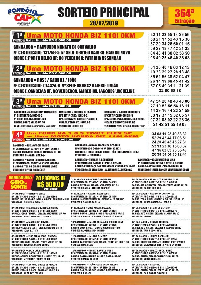 Os prêmios saíram para as cidades de: Porto Velho, Candeias do jamari, Buritis, Guajará Mirim, Ariquemes, Cacoal, Alto Paraiso, Cujubim, Ji Paraná, Vilhena, Machadinho do Oeste, Cerejeiras, Pimenta Bueno, Alta Floresta do Oeste, Vale do Anari, Monte Negro, Nova Mamoré, Cabixi, Colorado do Oeste, Corumbiara, Jaru e Ouro Preto do Oeste.