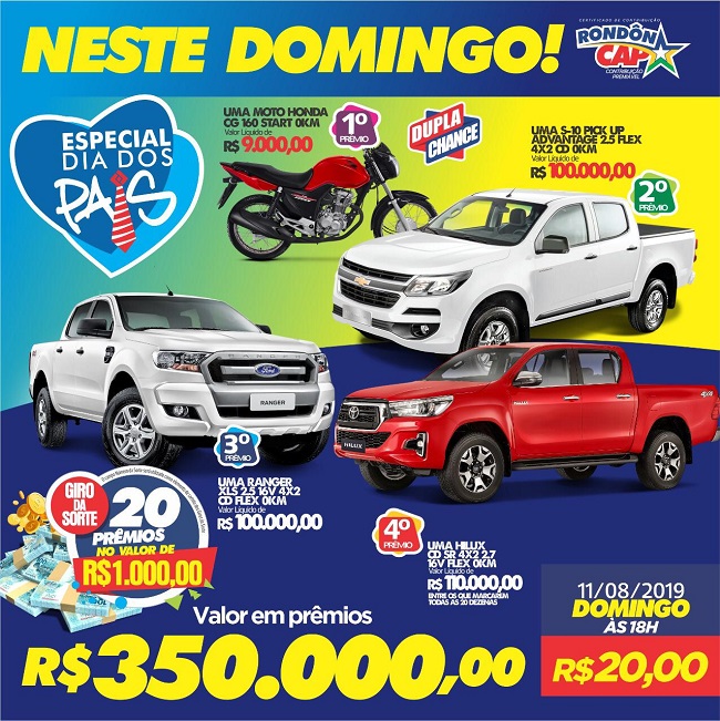 E neste domingo tem Rondoncap especial dia dos pais; serão 03 caminhonetes, serão 350 mil reais em prêmios. Compartilhe amor, ajude as Apaes e deixe a sorte ajudar você!