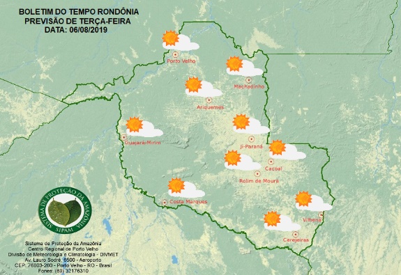 A Divisão de Meteorologia do Sistema de Proteção da Amazônia informa que a massa de ar polar começa a perder força e as temperaturas voltam a subir em Rondônia nesta terça-feira. A previsão é de um dia ensolarado em todo o Estado. Poucas nuvens se formam e não há previsão de chuva. O calor reaparece em todas as áreas, mas as temperaturas ainda ficam amenas durante a noite e madrugada. A umidade do ar fica baixa no período da tarde e algumas regiões do Estado podem entrar em estado de alerta com valores mínimos de umidade chegando abaixo de 20%.