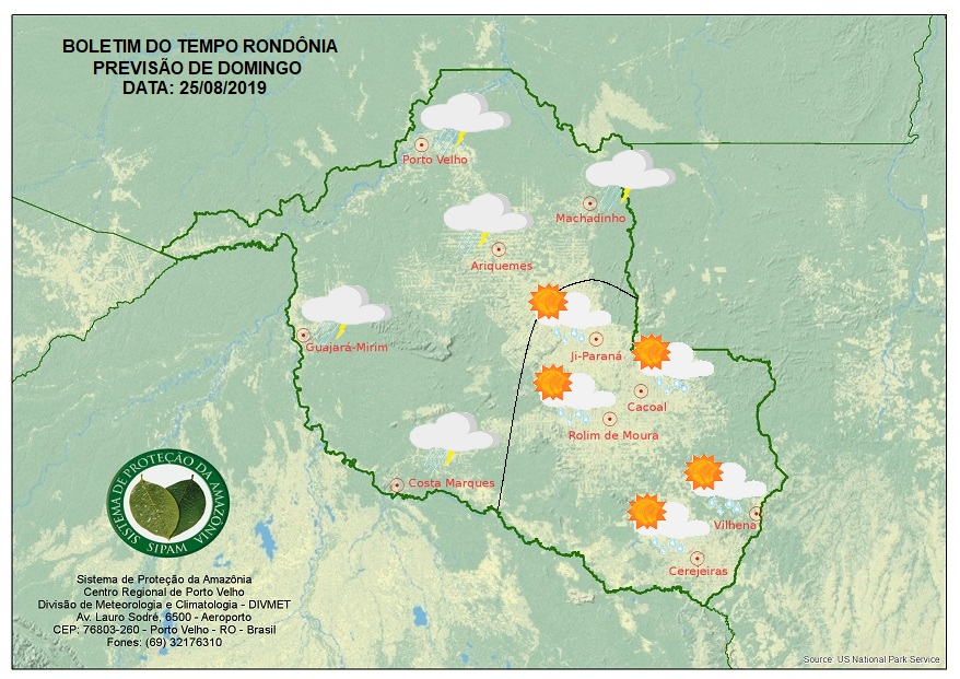 A Divisão de Meteorologia do Sistema de Proteção da Amazônia informa que com a intensificação do fluxo de vento de norte para sul, contribui para o transporte de umidade para as demais áreas do estado. Com isso há a previsão de chuvas em todo o estado nesse domingo, que irá amenizar os efeitos das queimadas na região. No centro norte e oeste do Estado o tempo varia de parcialmente nublado a nublado e pode ocorrer pancadas isoladas de chuva seguidas de trovoadas. Nas demais áreas do centro-sul Rondoniense o céu varia de claro a parcialmente nublado e as chuvas ocorrer como pandas isoladas.
