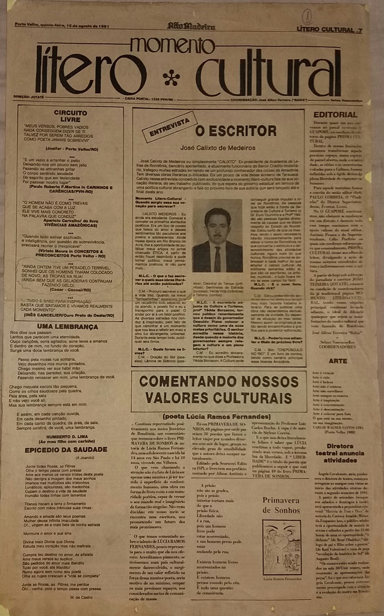 Histórico da página impressa e semanal MOMENTO LÍTERO CULTURAL ( 15 de agosto de 1991 a 5 de julho de 2012), jornal ALTO MADEIRA. Atualmente no jornal rondoniaovivo.com