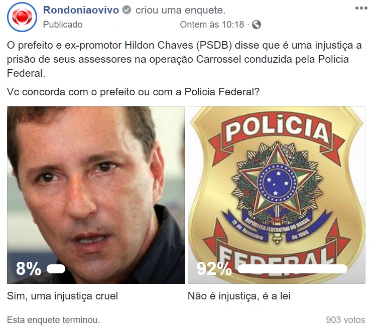 Uma enquete levantada pelo jornal Rondoniaovivo através de sua página no Facebook, questionou os internautas se eles concordavam com a opinião do prefeito Hildon Chaves (PSDB) de que as prisões realizadas durante o desencadeamento da Operação Carrossel, pela Polícia Federal, na última quarta-feira (4) teriam sido realizadas de forma injusta.