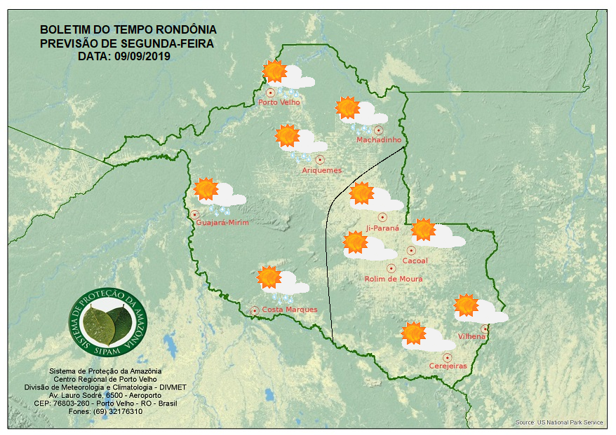 A Divisão de Meteorologia do Sistema de Proteção da Amazônia informa que ao longo deste fim de semana o tempo continua instável em todo o Norte Rondoniense. Para a Capital e regiões central, do Vale do Guaporé e do Vale do Jamari, o sábado será de predomínio de sol entre nuvens pela manhã e aumento de nebulosidade ao longo do dia, com o céu variando de parcialmente nublado a nublado e ocorre pancadas de chuvas e trovoadas em áreas isoladas entre a tarde e noite. Na região da Zona da Mata e Sul do Estado o sol predomina, faz muito calor e o tempo varia de claro a parcialmente nublado, com possibilidade de pancadas isoladas de chuva com trovoadas à tarde.