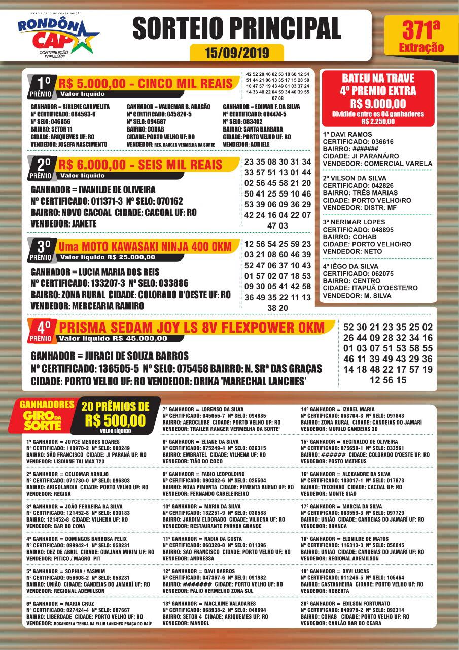 Os prêmios saíram para as cidades de Ariquemes, Porto Velho, Colorado do Oeste, Cacoal, Ji Paraná, Itapuã do Oeste, Vilhena, Guajará Mirim, Candeias do Jamari e Pimenta Bueno.