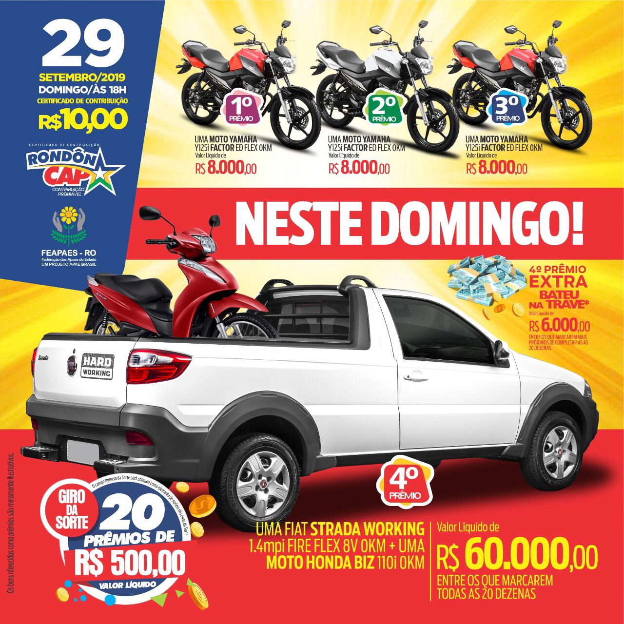 E neste domingo o Rondoncap vai sortear uma Pick Up Strada com uma Moto na carroceria, mais 03 motos e prêmios em dinheiro.