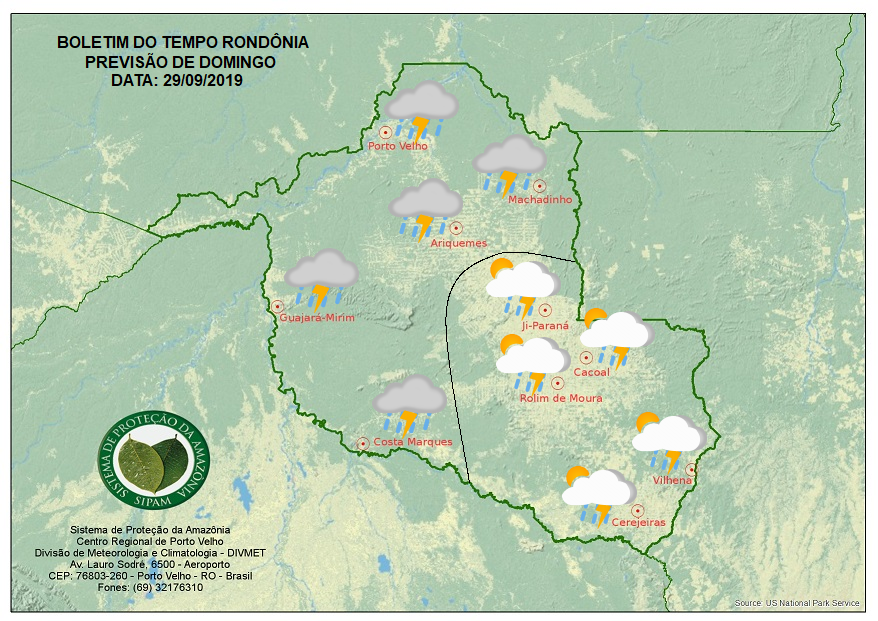 A Divisão de Meteorologia do Sistema de Proteção da Amazônia informa que o sábado será de tempo instável em todo o estado. O tempo deverá variar de parcialmente nublado a nublado em todas as regiões. E está previsto que ocorram pancadas de chuvas e trovoadas em todo o estado. Porém no centro-sul, essas pancadas ocorrem de forma isolada.