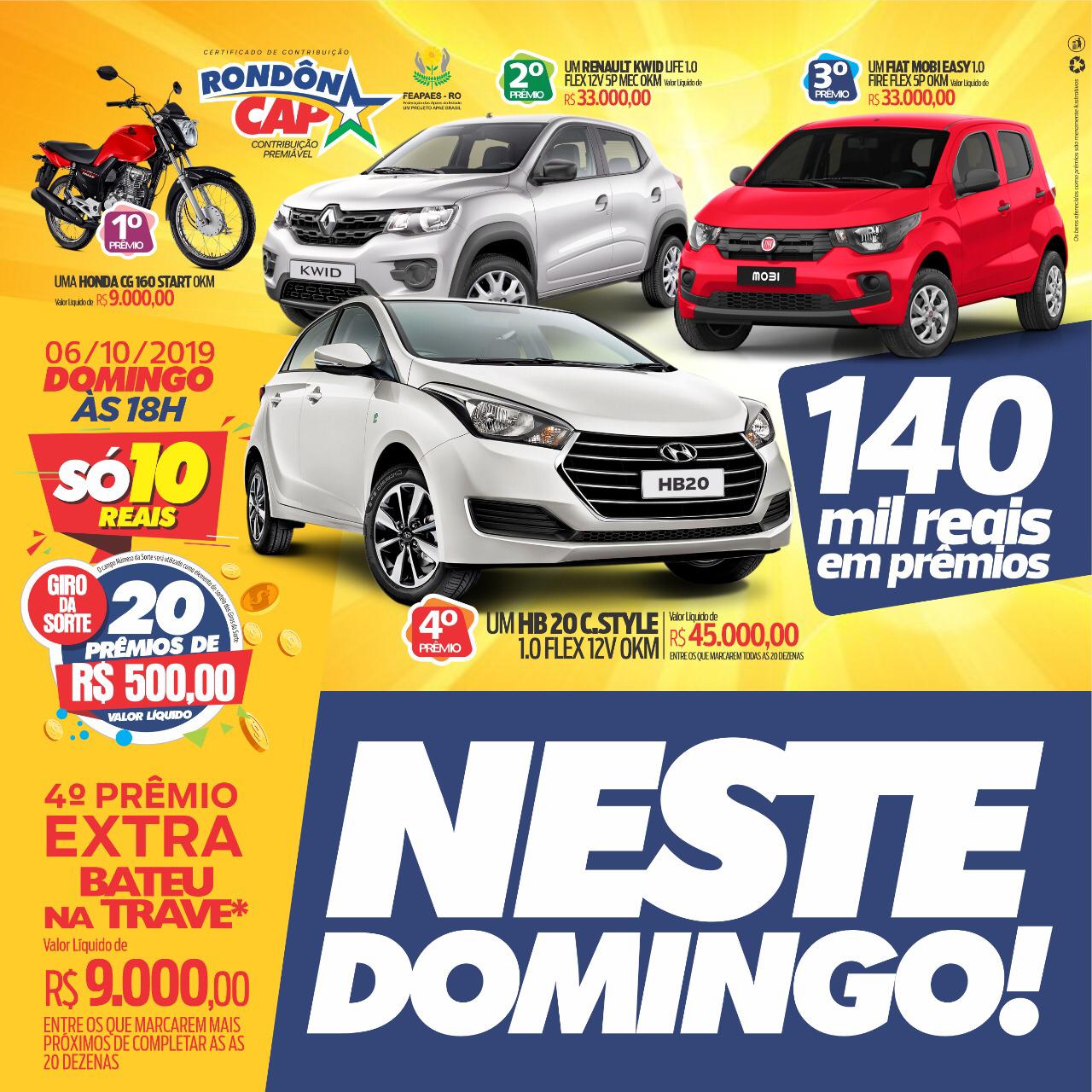 E no próximo domingo o Rondoncap vai sortear 03 carros zero kilometro - 140 mil reias em prêmios.