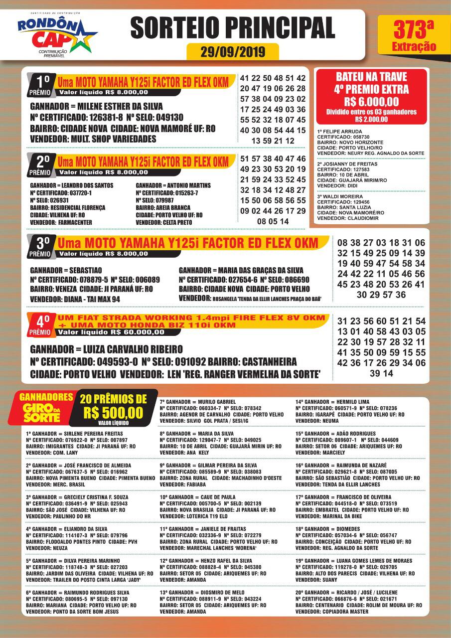 Continue participando, incentive seus amigos a participarem; Quem ajuda, a sorte ajuda. Os prêmios do sorteio realizado no domingo dia 29 de setembro, saíram para as cidades de Nova Mamoré, Vilhena, Porto Velho, Ji-Paraná, Pimenta Bueno, Guajará Mirim, Machadinho do Oeste, Ariquemes e Rolim de moura.