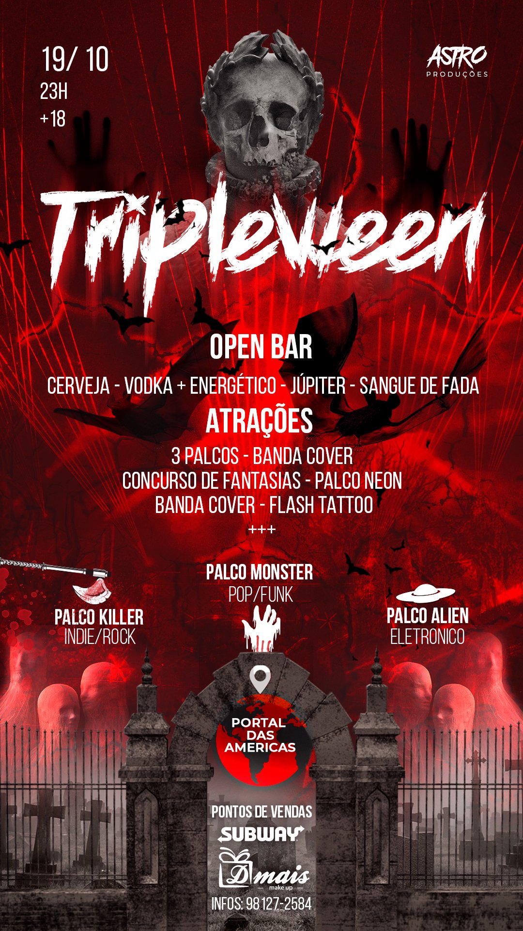 No próximo sábado acontecerá uma mega festa de halloween em Porto Velho. Três palcos, decoração temática, concurso de fantasia, várias atrações e open bar! A tripleween acontecerá no Portal das Américas localizado no quilêmetro 5 da BR-364, a partir das 23h.