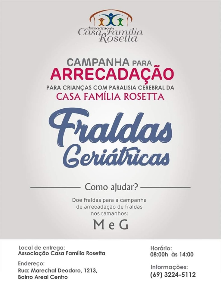 Por isso foi iniciada uma companha para a arrecadação de fraldas geriátricas. Você, que tiver interesse em doar, basta entrar em contato pelo telefone (69) 9.9289 2077 WhatsApp. A necessidade de primeira ordem são fraldas tamanhos M e G.