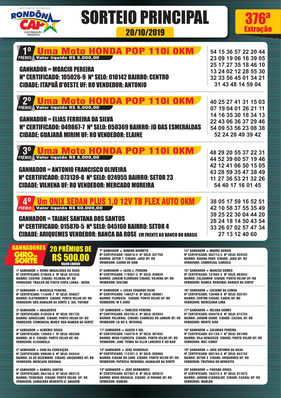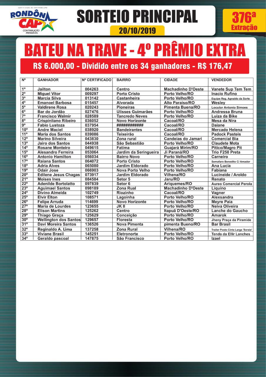 Os prêmios saíram para as cidades de Itapuã do Oeste, Guajará Mirim, Vilhena, Ariquemes, Porto Velho, Jaru, Candeias do Jamari, Ji Paraná, Cabixi, Cacoal, Machadinho do Oeste, Alto Paraíso e Pimenta Bueno.