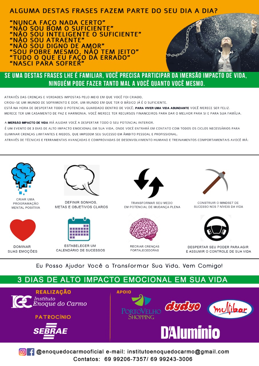 A Imersão de Impacto de Vida irá ajudar você a despertar todo seu potencial interior, quer saber mais participe, o evento será no L’ Acordes Hotel, Rodovia BR-364 8250, Aeroclube, Porto Velho.