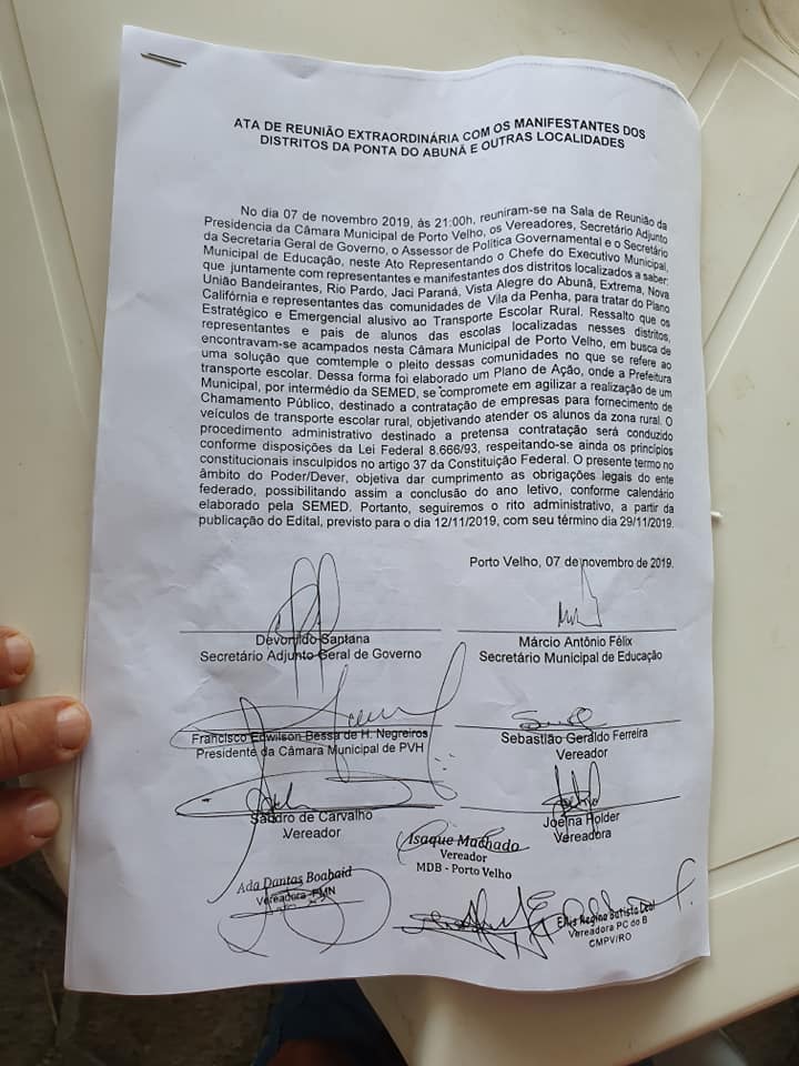 Para que a comunidade pudesse sentir-se segura em relação ao acordo, uma ata de reunião foi firmada com a assinatura de oito vereadores, além do secretário municipal de educação e do secretário adjunto geral de governo da Prefeitura de Porto Velho.