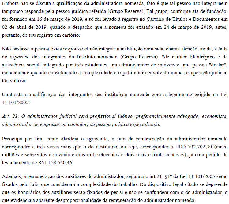 Mas a mesma administradora também está gerindo o patrimônio da empresa Guareschi Participações S.A., e outras, com honorários fixados no percentual de 4%, superior em dobro ao que antes teria sido fixado, e envolve a quantia de R$ 2.930.636,48 (dois milhões, novecentos e trinta mil, seiscentos e trinta e seis reais e quarenta e oito centavos).