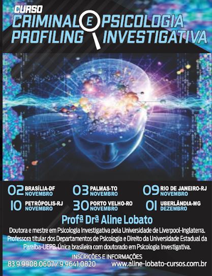 Quem ministrará é a professora doutora Aline Lobato, doutora e mestre em Psicologia Investigativa-Universidade de Liverpool-Inglaterra. Professora titular dos departamentos de Psicologia e de Direito da Universidade Estadual da Paraíba-UEPB. Única brasileira com doutorado em Psicologia Investigativa.