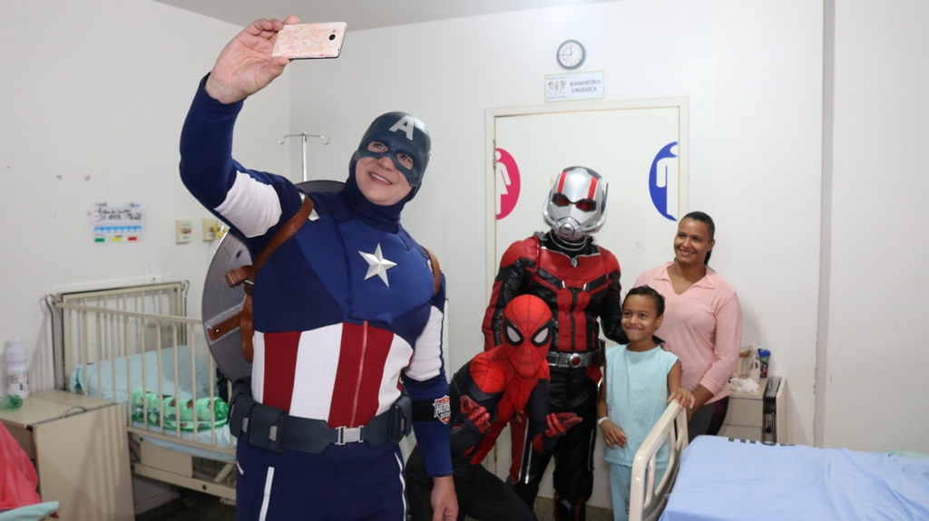 Os personagens do universo infantil que encantam as crianças, como o Capitão América, Homem Aranha, Super-Homem, Batman, Mulher Maravilha, entre outros, levaram muita alegria aos pequenos pacientes internadas no Hospital Infantil Cosme e Damião (HICD), nos sábado 16.