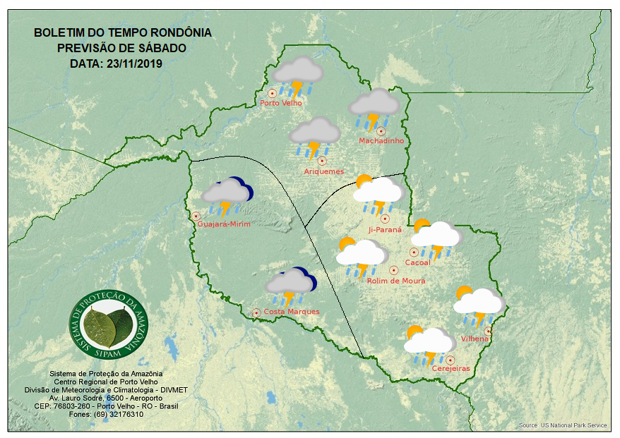 A Divisão de Meteorologia do Sistema de Proteção da Amazônia informa que há previsão de pancadas de chuvas e trovoadas em todo o estado nesse sábado. A atmosfera continuará bastante instável em todo o estado. proporcionando a formação de nuvens de chuva que faz com que o tempo varie de nublado a encoberto no vale do Guaporé, de parcialmente nublado a nublado no centro sul Rondoniense e permaneça nublado durante todo o dia no norte do estado.