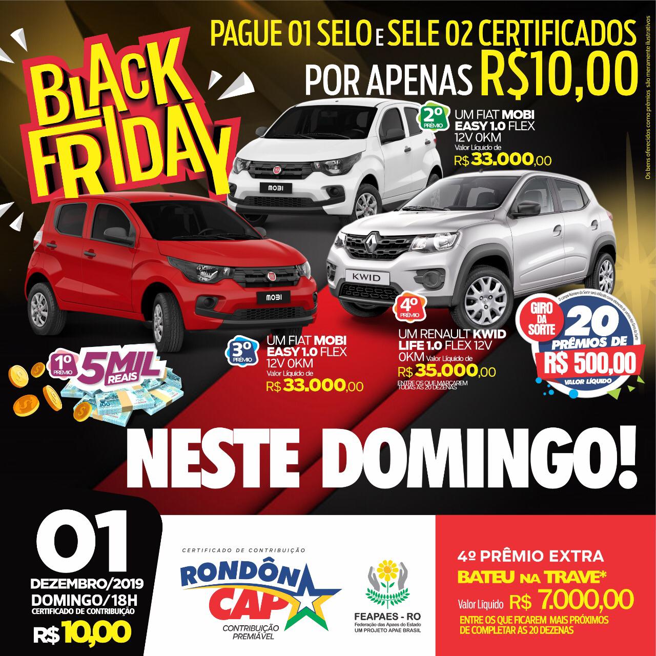 Black Friday RONDONCAP, são 03 carros e muitos prêmios em dinheiro. Você paga um e leva dois. Compartilhe amor, ajude as Apaes e deixe a sorte ajudar você.