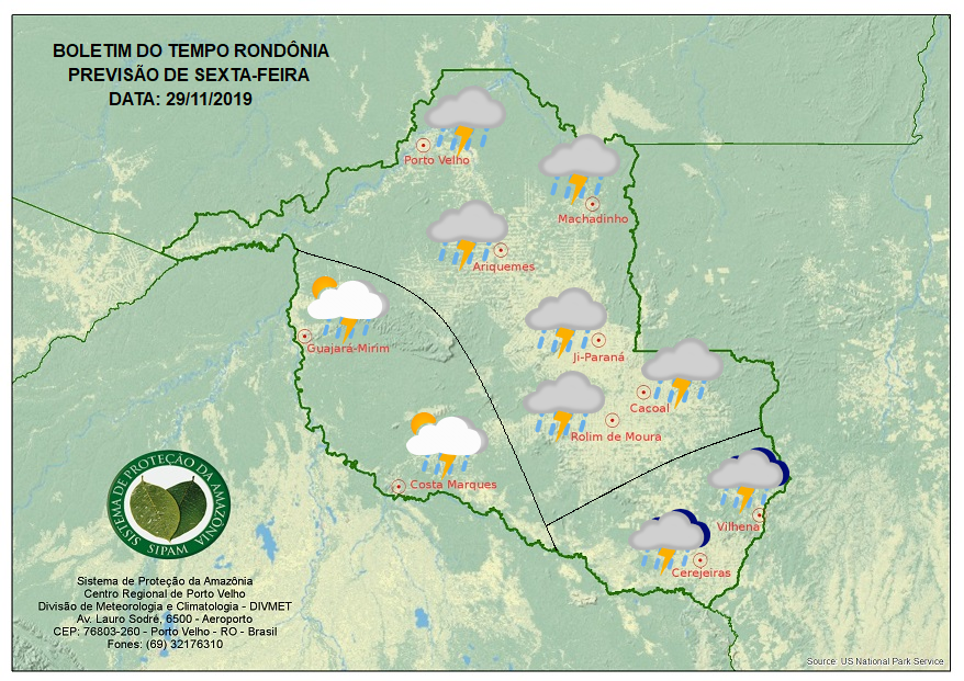 A Divisão de Meteorologia do Sistema de Proteção da Amazônia informa que a divergência dos fluxo de ventos sobre o estado de Rondônia gera bastante instabilidade na atmosfera sobre o Estado. Com isso, nessa sexta-feira a previsão ainda será de pancadas de chuvas que poderão ser acompanhadas de trovoadas. O tempo deverá variar de nublado a encoberto no cone sul e permanecer nublado durante todo o dia nas de mais regiões. Já no oeste do Estado o tempo varia de parcialmente nublado a nublado por conta da Alta da Bolívia (circulação anti-horária que ocorre em altos níveis da troposfera, formando um centro de alta pressão), toma forma, ficando o seu centro muito próximo da região.