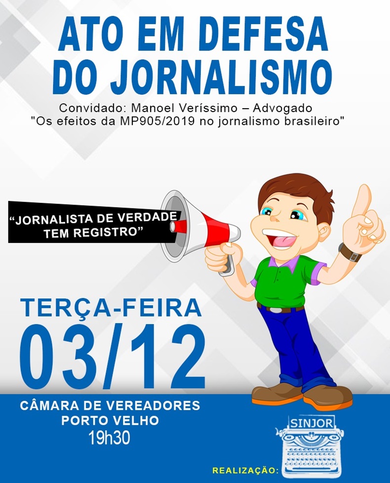 Os efeitos da Medida Provisória 905/2019, que extingue a obrigatoriedade do registro profissional para jornalistas e publicitários, será tema de debate na próxima terça (3), às 19h30, na Câmara de Vereadores de Porto Velho. Trata-se de um ato em defesa do registro profissional com objetivo de discutir os efeitos da MP no jornalismo brasileiro, movimentado pela classe de profissionais de imprensa do Estado de Rondônia. O evento é aberto a toda a sociedade.