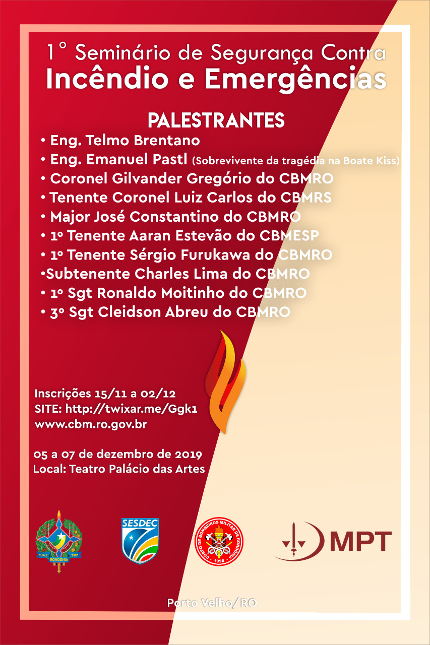 O I Seminário de Segurança Contra Incêndio e Emergências é um evento que será realizado pela Coordenadoria de Atividades Técnicas (CAT) do Corpo de Bombeiros Militar de Rondônia, que tem como objetivo propiciar aos profissionais com formação em Engenharia e Arquitetura, profissionais ligados à área de Prevenção e Proteção contra Incêndios – Bombeiros Militares, Civis e Voluntários, profissionais da área de Segurança do Trabalho e a população em geral, um espaço para adquirir conhecimentos e realizar debates relacionados ao tema do evento.