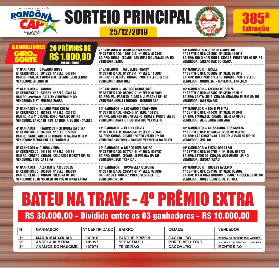 Os prêmios do sorteio especial de natal saíram para as cidades de Porto Velho, Guajará Mirim, Cacoal, Cerejeiras, Vilhena, Novo Paraiso, Colorado do Oeste, Candeias do Jamari, Ji Paraná e Ariquemes. O ganhador do Camaro foi o Matheus souza das chagas, morador da cidade de Porto Velho.