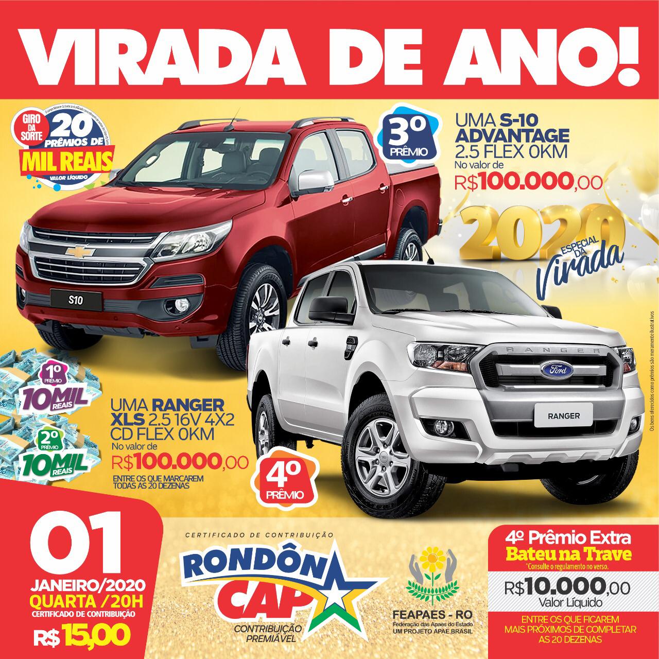 Com o Rondoncap, você ajuda as Apaes e deixa a sorte ajudar você! No sorteio especial da virada tem uma caminhonete S10 no terceiro prêmio e mais uma caminhonete Ford Ranger no quarto prêmio. Serão duas caminhonetes e muita emoção, participe; compartilhe amor, ajude as Apaes e deixe a sorte ajudar você. Rondoncap, realizando sonhos e mudando vidas.