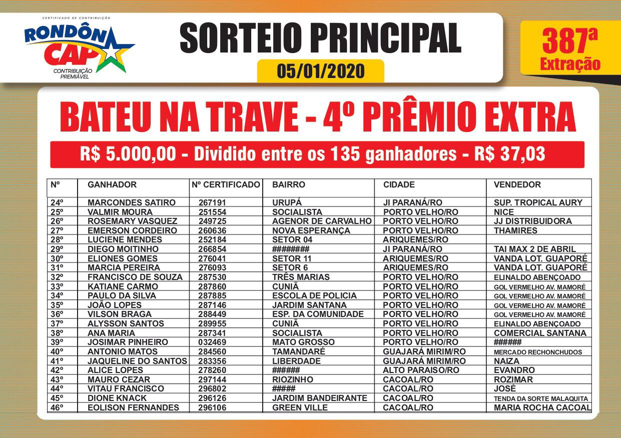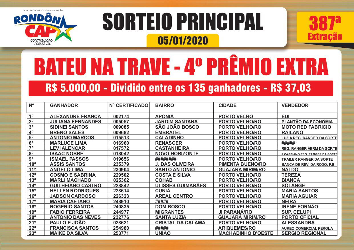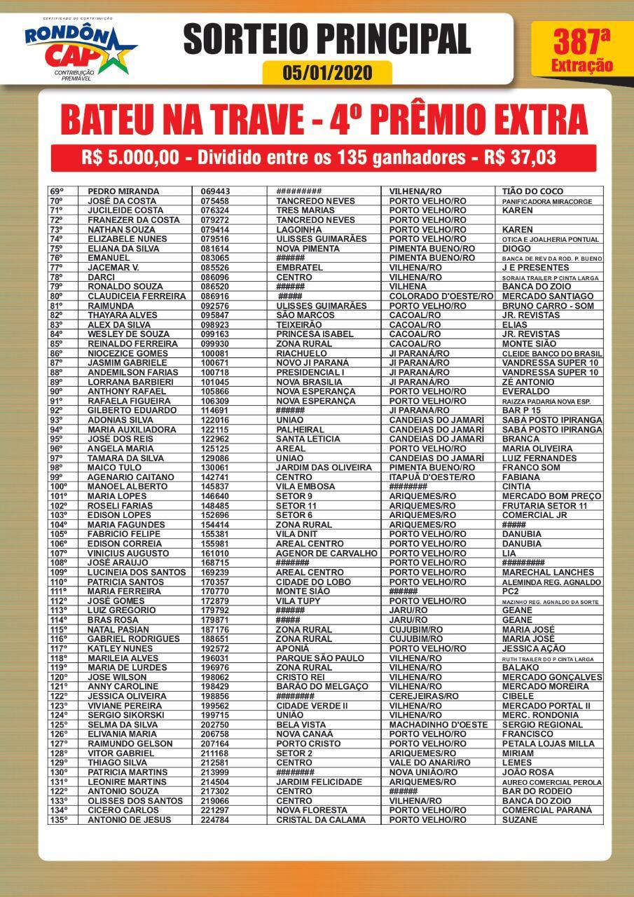 Resultado do sorteio do prêmio “Bateu na Trave” ( Pessoas que ficaram por um número para ganhar o quarto prêmio). 135 pessoas ganharam o prêmio “Bateu na Trave”; ou seja: Ficaram por um número para ganhar o quarto prêmio; um Pick Up Strada no valor líquido de R$ 50 mil reais.