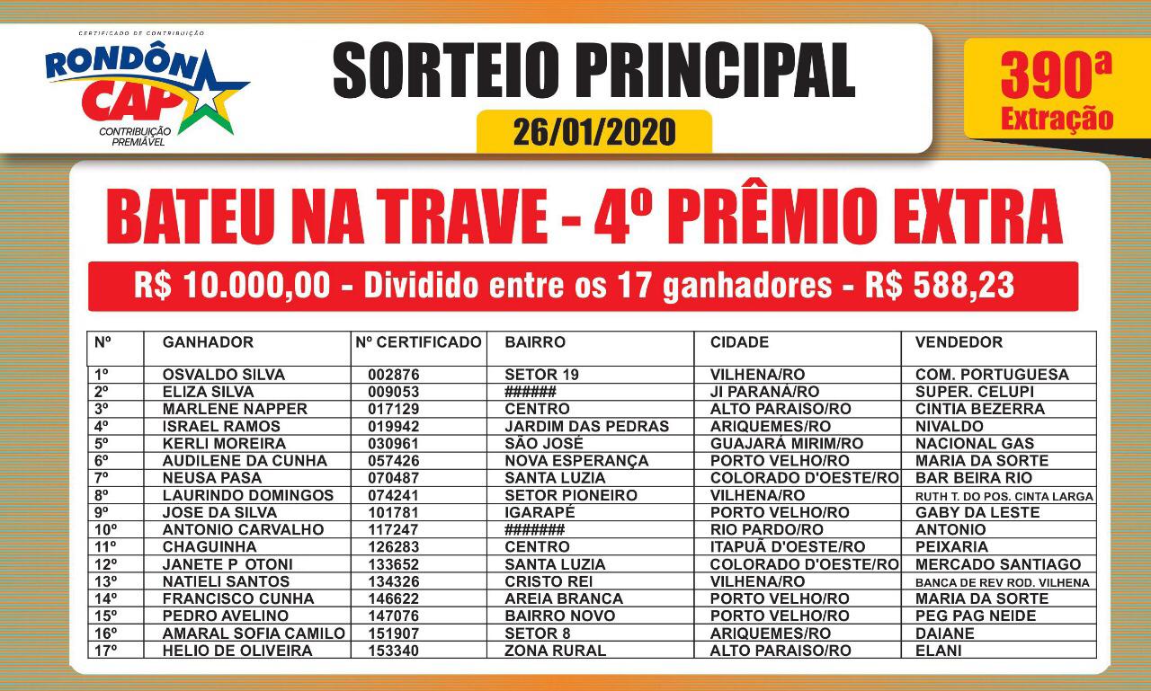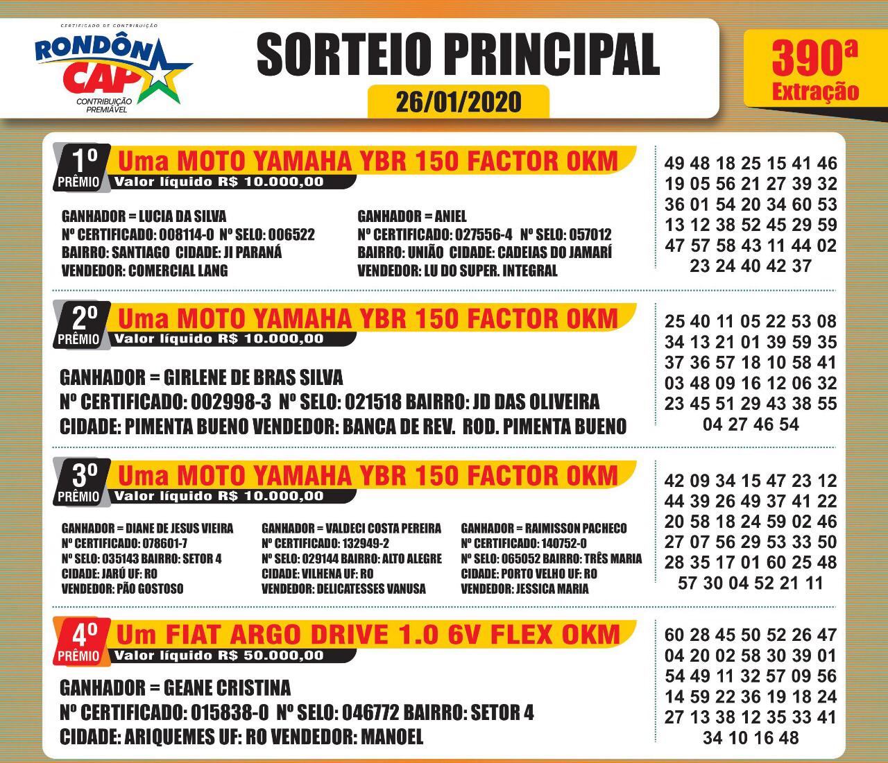 Quem ganhou o Fiat Argo sorteado no quarto prêmio foi a Geane Cristina da Cidade de Ariquemes, as motos sorteadas no primeiro, no segundo e terceiro prêmios saíram para as cidades de Ji Paraná, Candeias do Jamari, Pimenta Bueno, Jaru, Vilhena e Porto Velho, também tivemos os ganhadores dos Giros da sorte e quem ficou por um número para ganhar o Fiat Argo, ganhou o prêmio Bateu na Trave.