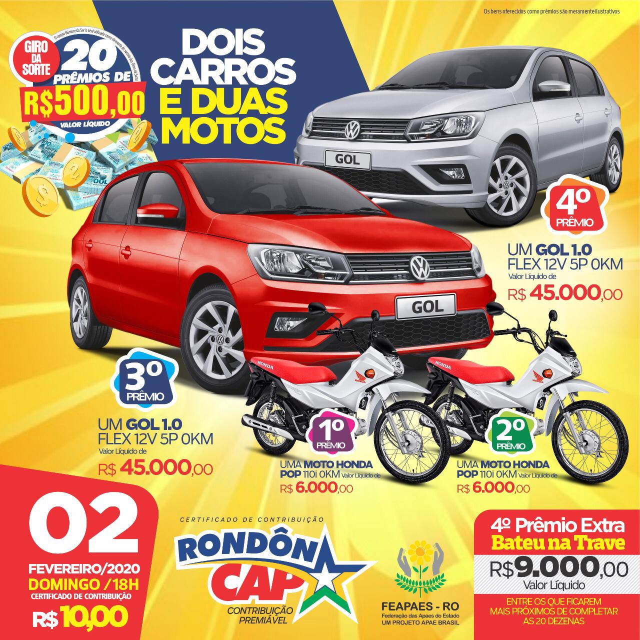São dois carros, duas motos Honda e mais prêmios em dinheiro. É um carro no terceiro prêmio e mais um carro no quarto prêmio. Compartilhe amor, ajude as Apaes e deixe a sorte ajudar você. Rondoncap, realizando sonhos e mudando vidas, pode acreditar a sua sorte vai chegar!