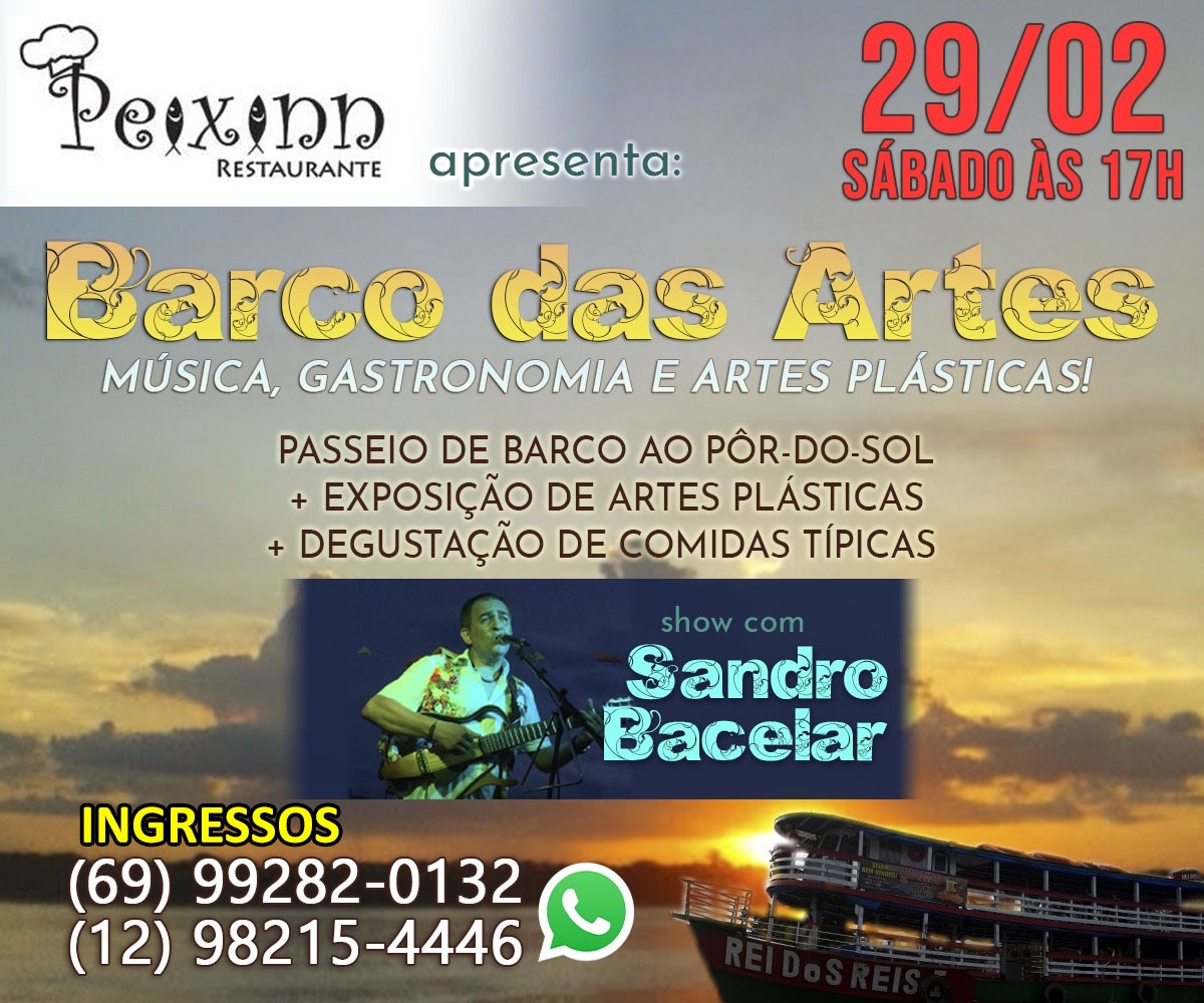Neste sábado (29) acontece mais uma edição do Barco das Artes, que por duas horas e meia levará música, gastronomia, poesia e artes plásticas a bordo do navio Reis dos Reis pelo rio Madeira.