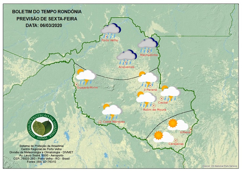 Em Rondônia, a região norte será a área mais afetada, nessa região o tempo deve variar entre nublado e encoberto, e o dia será chuvoso.