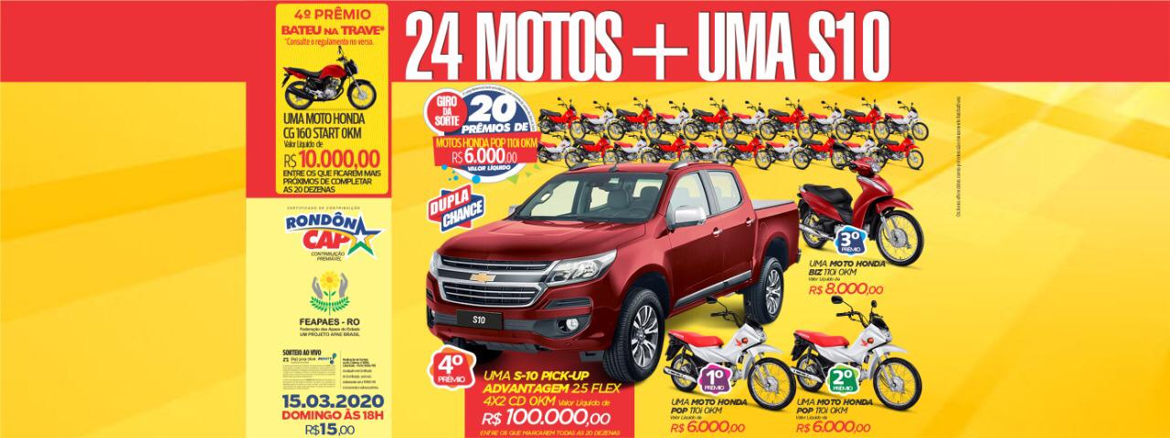 No próximo domingo, dia 15, serão 25 veículos sorteados. Uma caminhonete S-10 no quarto prêmio; Uma Honda FAN no bateu na Trave; Uma Biz e duas motos Pop e mais 20 motos Honda Pop no Giro da Sorte. Boa sorte!!!