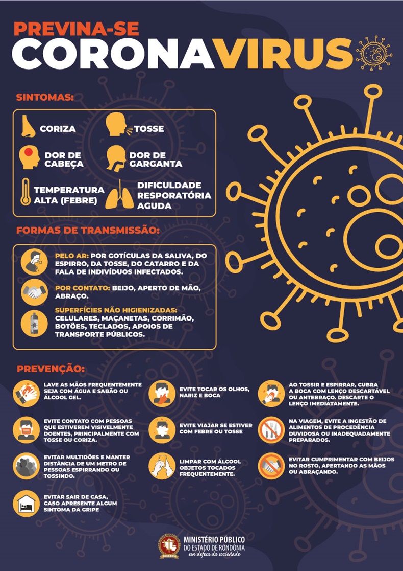 Para estimular a prevenção do novo coronavírus, o Ministério Público do Estado de Rondônia inicia essa semana uma campanha, com uma série de informações sobre os principais sintomas da doença e as maneiras de evitar o contato com o vírus. A ideia é mobilizar membros, servidores e o público em geral que frequenta as dependências da Instituição para a importância de manter hábitos simples, mas capazes de evitar o contágio.