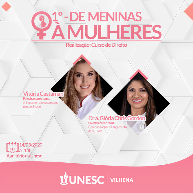 A coordenação do Curso de Direito da Unesc de Vilhena, promove o evento denominado “De Meninas a Mulheres”, em alusão ao Dia Internacional da Mulher, comemorado oficialmente no último dia 08. O projeto deve alcançar um público aproximado de 70 mulheres, entre acadêmicas de Direito, mas, é aberto ao público feminino.
