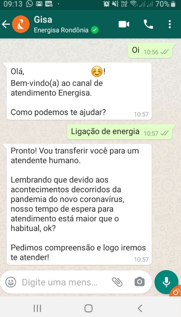 A partir dessa quarta-feira (25), os clientes da Energisa Rondônia contam com mais um canal de atendimento para solicitar diferentes serviços pelo celular: a Gisa é a atendente virtual por inteligência artificial que funciona pelo WhatsApp (69 9 9358-9673), o aplicativo mais utilizado no Brasil. A chegada do serviço contribui para as medidas de prevenção adotadas pela empresa, que fechou temporariamente as suas agências comerciais em todo o Brasil.