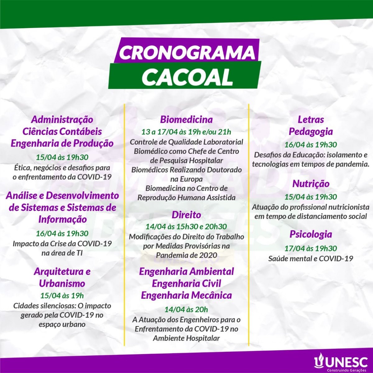 O diretor executivo da Unesc citou como exemplo áreas como a Pedagogia, onde os usos das tecnologias estão sendo essenciais neste momento de isolamento social. “A educação toda está acontecendo através do uso das tecnologias remotas e muitos profissionais não tem essa habilidade. Então a idéia é despertar, através do debate, como olhar essas tecnologias a partir de agora! O que muda no perfil do pedagogo, a partir desta crise. Já na Psicologia, o debate será voltado à saúde mental da população, sobre a importância do enfrentamento dos indivíduos a essa pandemia. O nutricionista vai se dirigir a importância da alimentação neste período de isolamento, a necessidade de despertar uma consciência sobre isso”, ressaltou.