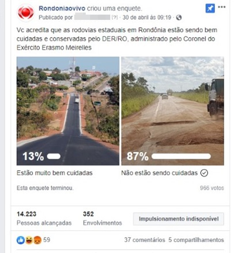O Rondoniaovivo fez uma enquete de 24 horas na sua página no Facebook, onde perguntou aos internautas: "Vc acredita que as rodovias estaduais em Rondônia estão sendo bem cuidadas e conservadas pelo DER/RO, administrado pelo Coronel do Exército Erasmo Meirelles?"