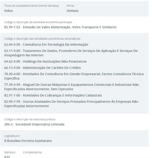 Fui pesquisar a empresa vencedora' lá do Goiás', a Volus Tecnologia e Gestão de Benefícios. Na seu cadastro na Receita Federal tem como atividade principal a emissão de vales-alimentação, vales-transporte e similares.