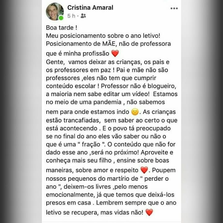 Uma postagem na rede social de uma professora dá uma opinião muito parecida com a minha em relação a educação em tempos de pandemia. Confira print Abaixo.