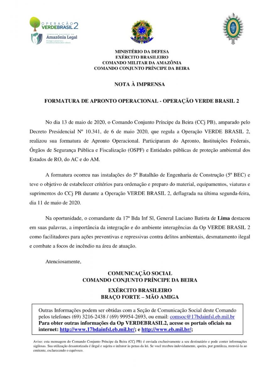 Uma formatura realizada na manhã desta quarta-feira (13), no 5º Batalhão de Engenharia e Costrução, em Porto Velho, reuniu militares do Exército, representantes do Corpo de Bombeiros, Polícia Militar e Polícia Rodoviária Federal.