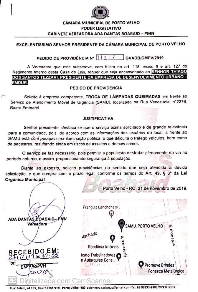 Em novembro de 2019 a vereadora Ada Dantas Boabaid (PDT) encaminhou à Empresa Municipal de Desenvolvimento Urbano (Emdur), o Pedido de Providência nº 11.217 solicitando a troca de lâmpadas queimadas nas dependências da base do Serviço de Atendimento Móvel de Urgência (Samu). O pedido contemplaria ainda a frente da Maternidade Municipal Mãe Esperança, que fica ao lado do Samu.